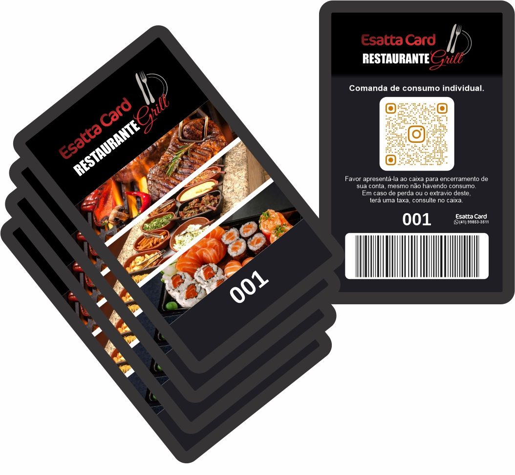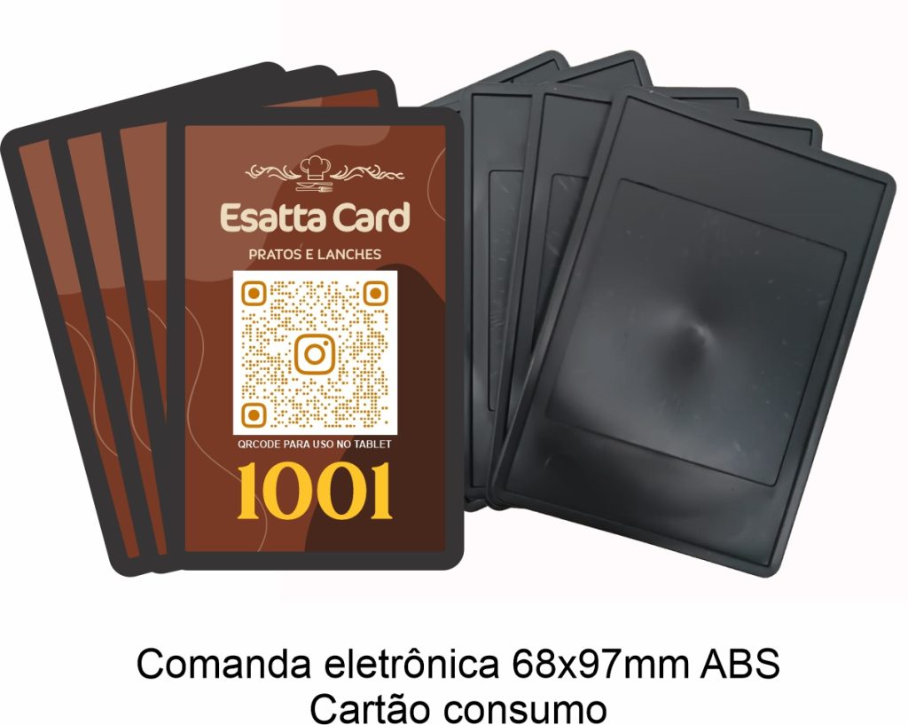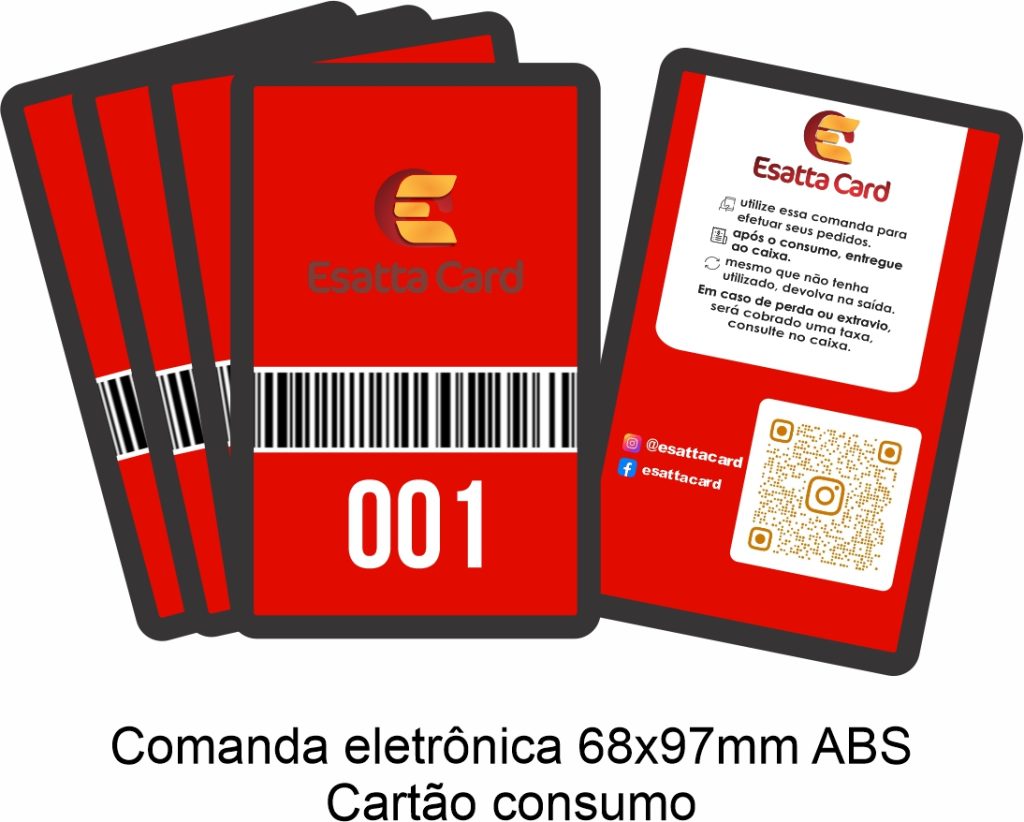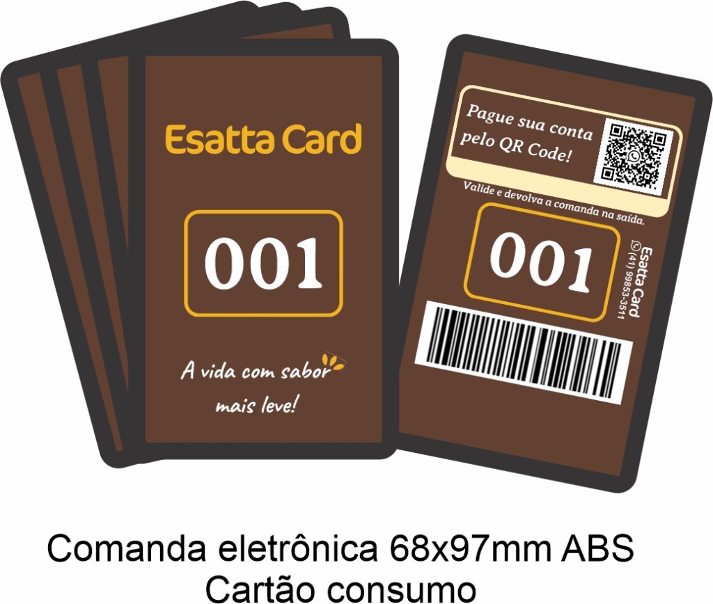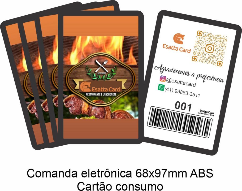 Produzimos comandas eletrônicas e cartões de consumo com materiais resistentes como PVC laminado e plástico ABS, disponíveis em diferentes tamanhos e layouts.
